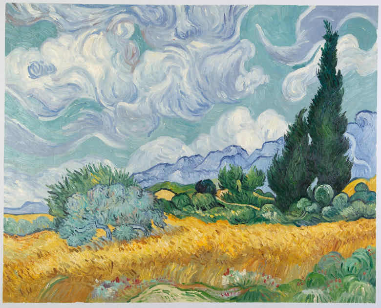 1889年,梵高在法国南部的阿尔创作了这幅帆布油画,作品描绘了暴风雨来临前的葱翠田野的景象。