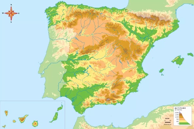 处的 伊比利亚半岛位于 欧洲最 西端,以北面的 比利牛斯山脉与 法国分界。 半岛东临地中海,西临大西洋,半岛内平原主要分布于 海岸线附近,内陆的山脉纵横,将半岛切割为若干个较为独立的 地 理区域。加之海岸线漫长,拥有众多天然良港,并且同时濒临大西洋与地中海两片海洋,这些地理特征为西班牙在15-16世纪的崛起创造了无可比拟的优势。