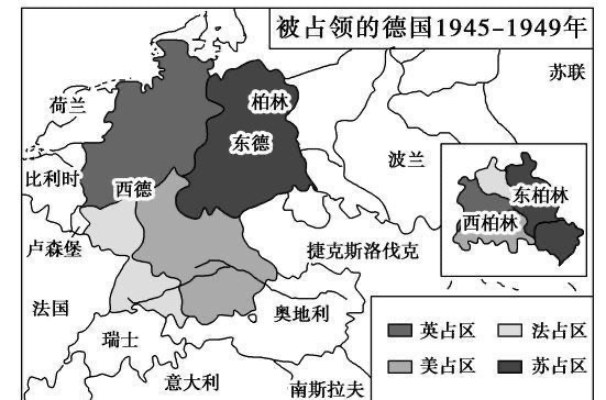 二战战败,被苏联、美、英、法四个战胜国占领,一分为四。苏联也 与 美、英、法分别占领东柏林与西柏林。 此后,四个战胜国合组“盟国管制理事会”,希望能共同治理德国,但 是 苏联与 美、英、法等 西方国家在治国理念上出现了 分歧,于 是 ,美、英、法自成一伙,共同制定宪法,统治德国西部,成立德意志联邦共和 国,是 为西德。苏联则在 德国东部建立德意志民主共和 国,是 为东德。两德除了政治制度相左、各自发行货币外,东德政府还实施“柏林封锁”,切断了东西柏林来往的交通方式。
