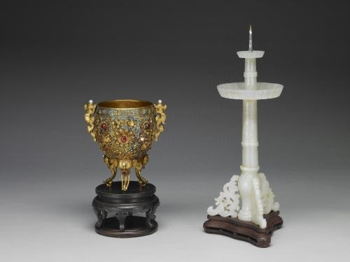 但据专家考察,景泰朝的许多掐丝珐琅器并非当时烧造,而是前代器物的改造。这件精彩的掐丝珐琅炉就是景泰年间改造的元朝珐琅器,炉的錾花内胆、底足与两只卷鼻象耳才是景泰朝工匠的后配。像这样的改造过的元代珐琅器珍品还有相当一些,景泰朝的工匠借元代珐琅的高品质为自己在中国工艺史上赚得了“景泰御前作坊之珐琅”的美誉,以至金属胎掐丝珐琅也被冠以“景泰蓝”之名。所以,此件景泰朝御制炉其实是元代珐琅工艺的杰作。