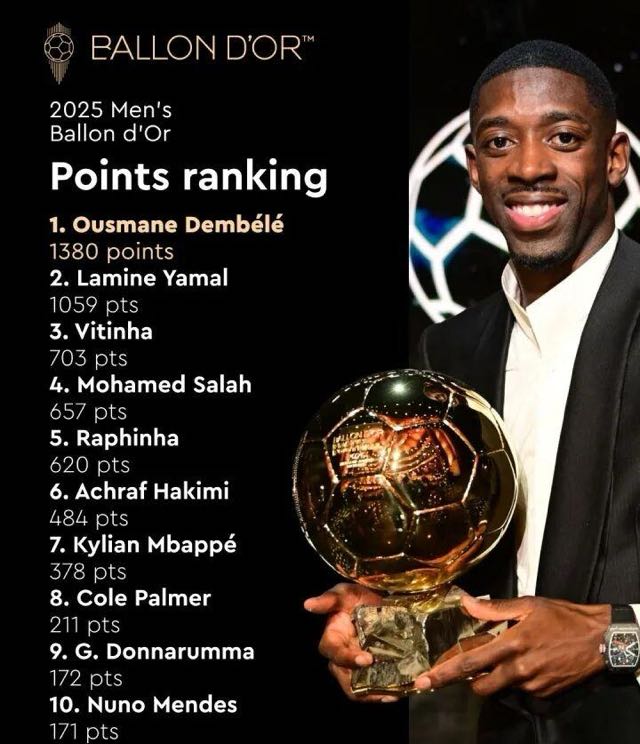 积分榜的 分数排行不难看出,所 有 球员之间的 差距感还是 比较明显的 。 登贝莱和 亚马尔是 所 有 球员之间最 亮眼的 两名,他 们也 是 积分达到上千的 球员。登贝莱的 优势在 于 他 所 获得的 投票要高于亚马尔,这名巴黎锋霸也 因此获得了 2025年金球奖。2025金球奖排名分数: