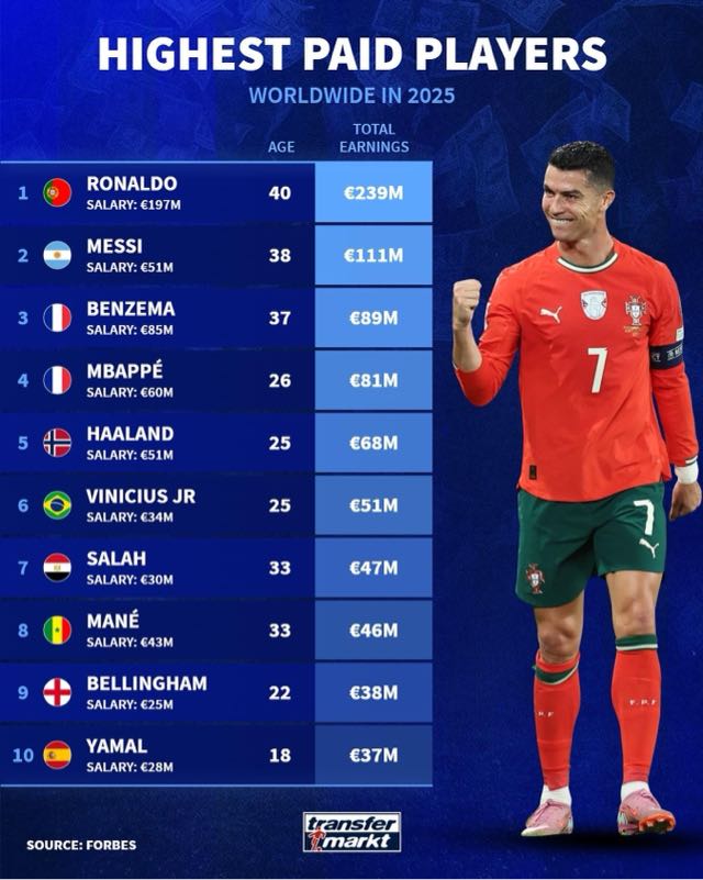 10月18日讯 德国《转会市场》网站近日公布了2025年全球足球运动员收入排行榜。令人瞩目的是,40岁的葡萄牙巨星C罗依旧位居榜首,以惊人的2.39亿欧元年收入稳居世界第一,展现出他无与伦比的商业影响力和持久的竞技价值。紧随其后的是38岁的阿根廷球王梅西,年收入达1.11亿欧元,两人也是榜单上唯二年收入超过1亿欧元的球员,再次证明“绝代双骄”的统治力依然无人撼动。【粉丝网】