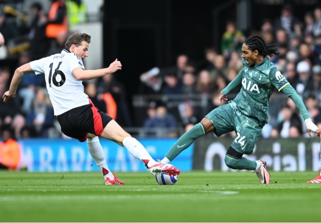 开场第4分钟,富勒姆的萨穆埃尔·丘库埃泽左路突破后助攻,肯尼·泰特禁区右路抽射,皮球变线入网,富勒姆1-0领先。第6分钟,热刺门将古列尔莫·维卡里奥出击失误,约书亚·金策动反击,哈利·威尔逊禁区外兜射空门得手,比分变为2-0。【粉丝网】第10分钟丘库埃泽内切兜射击中立柱,第26分钟范德芬关键铲断化解其单刀,热刺半场0-2落后。下半场热刺加强攻势,第59分钟卢卡斯·贝里瓦尔传球,穆罕默德·库杜斯禁区右侧爆射破门,比分1-2。此后热刺持续狂攻,第66分钟贝里瓦尔头球后蹭被希门尼斯门线解围,第81分钟穆阿尼脚后跟打门擦柱,多次错失扳平机会。富勒姆收缩防线稳守,第78分钟希门尼斯因手球吃到黄牌,最终将2-1比分保持至终场。