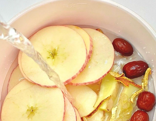 2、将柠檬片、苹果块和肉桂粉放入养生壶中,加入过滤水。