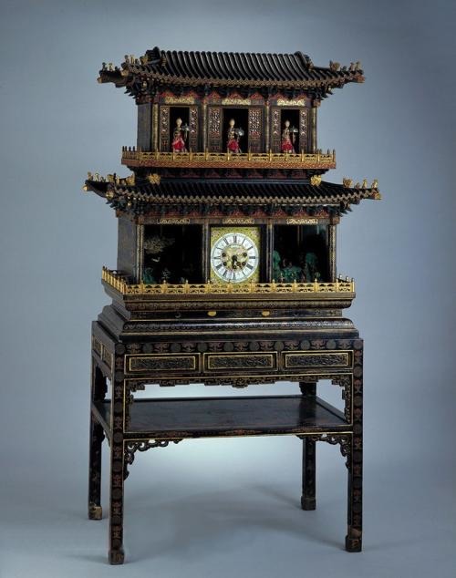 彩漆描金楼阁式自开门群仙祝寿御制钟为故宫钟表的代表作。高185cm,面宽102cm,侧宽70cm.此钟共有7套机械系统,分别控制走时、报时、景箱内的活动装置等,技术水准相当高。根据记录,从乾隆八年接旨着手设计到十四年完工,历时五年多。17世纪前,中国皇宫一直以铜壶滴漏计时。意大利传教士利玛窦带着两个西洋自鸣钟叩开了中国宫廷的大门。