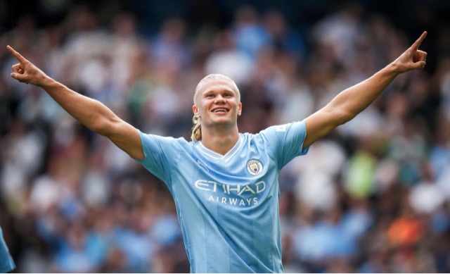 瓜迪奥拉的 体系下,他 的 进球效率再次被放大。英超首赛季(2022–23)打进36球,刷新英超单赛季进球纪录。帮助曼城赢得英超、足总杯、欧冠“三冠王”。从此彻底确立了 “当今世界第一中锋”的 地 位。